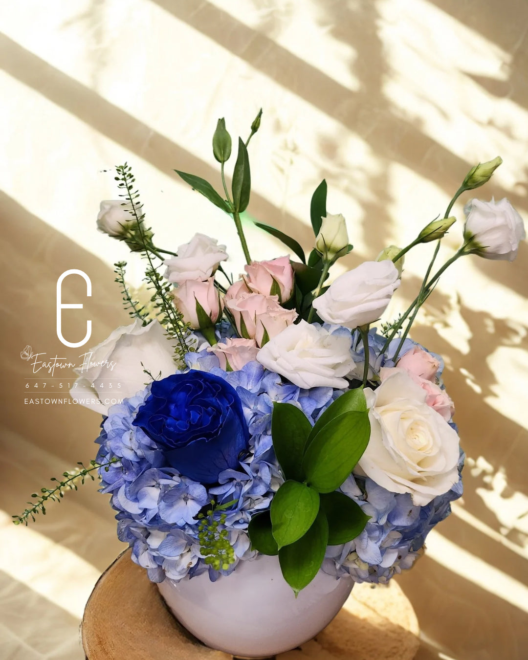 Find your calm with this stunning mix of cool blues and soft whites. Our 'Blue Serenity' arrangement features plush blue hydrangeas, a standout velvet blue rose, and is balanced with pure white roses and delicate lisianthus. An elegant choice for any occasion.