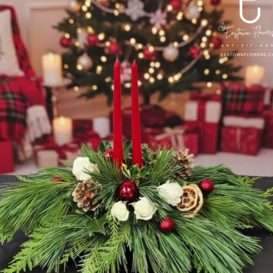 Create a warm, festive atmosphere with this 'Christmas Tradition' centerpiece. It’s a lush mix of fragrant greens, bright red berries, and pinecones, complete with a beautiful red bow and candles.