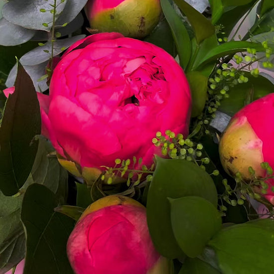 Full of life and color, this bouquet features vibrant coral peonies bursting with joy. Complemented by fresh eucalyptus and delicate greenery, "Peony Pop" is a cheerful and stylish way to brighten anyone's day.