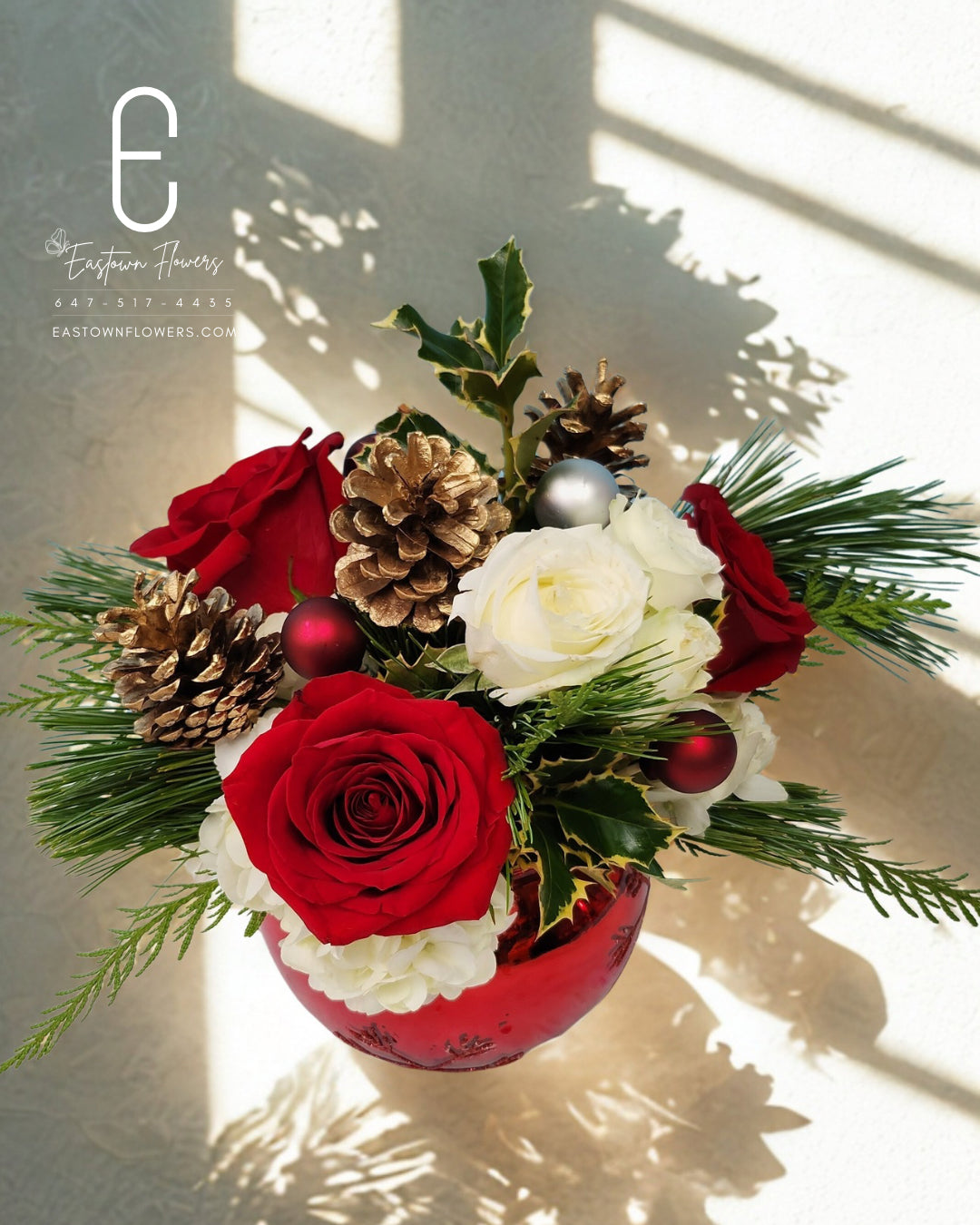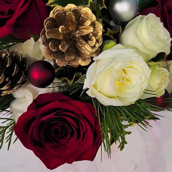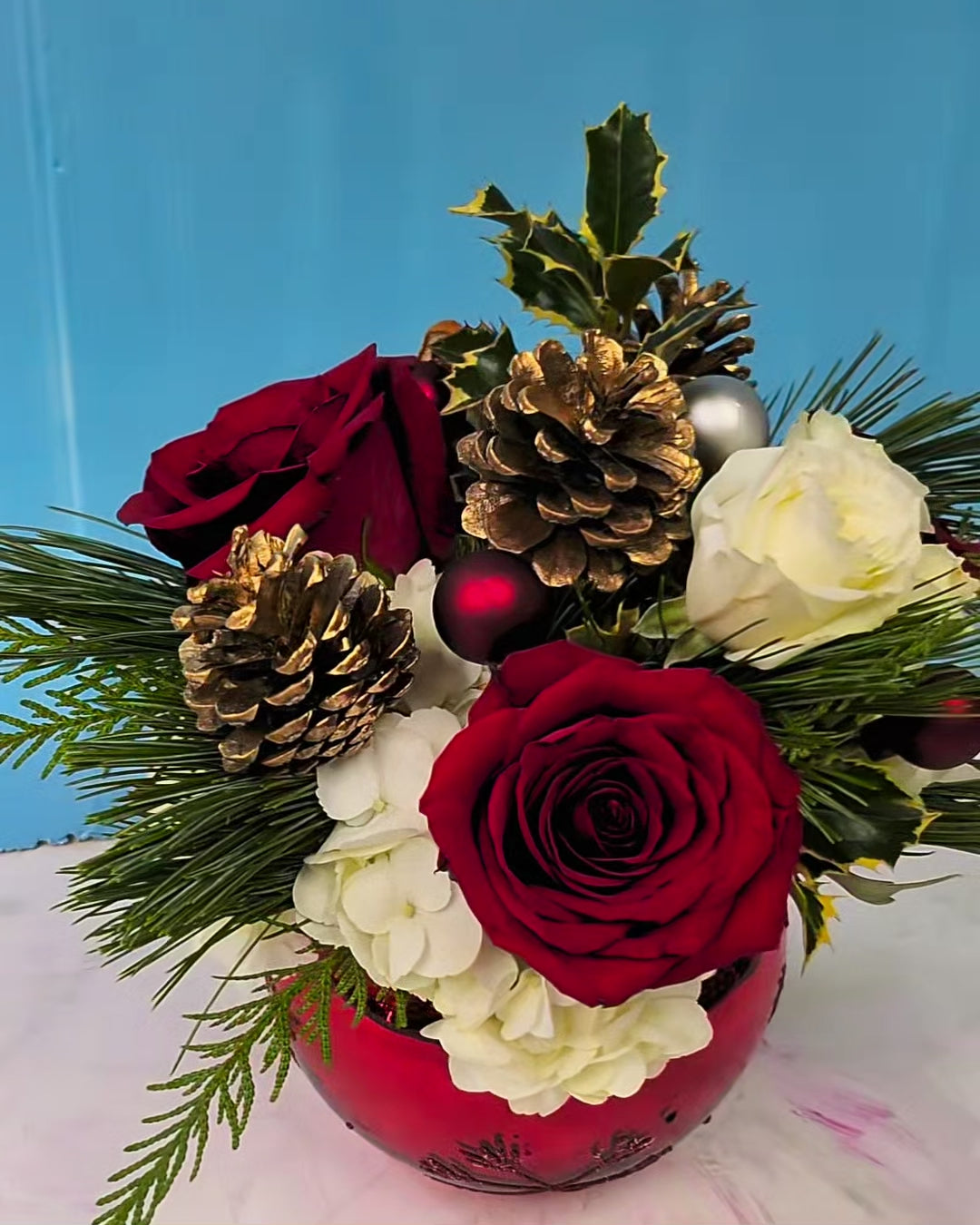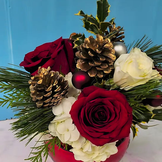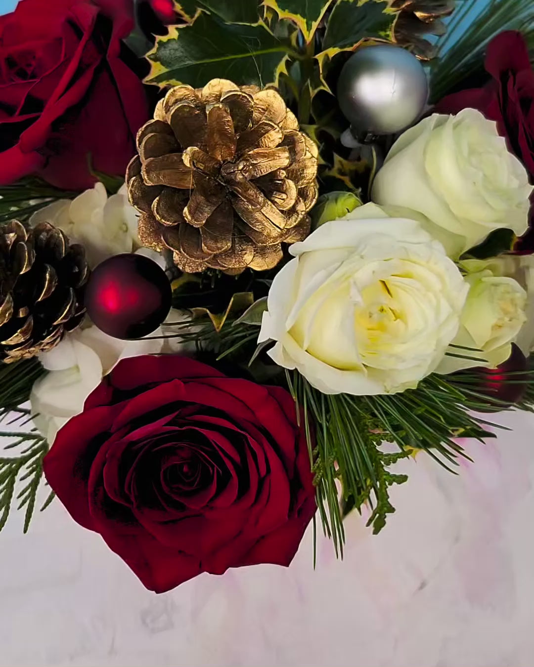 This is our 'Jingle Bells' vase. It’s a beautiful, full arrangement that mixes festive reds with soft, sweet pinks for a warm and romantic holiday.