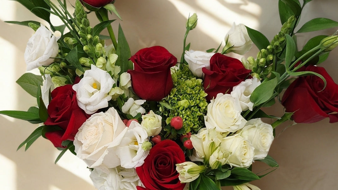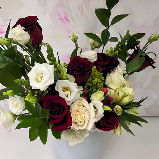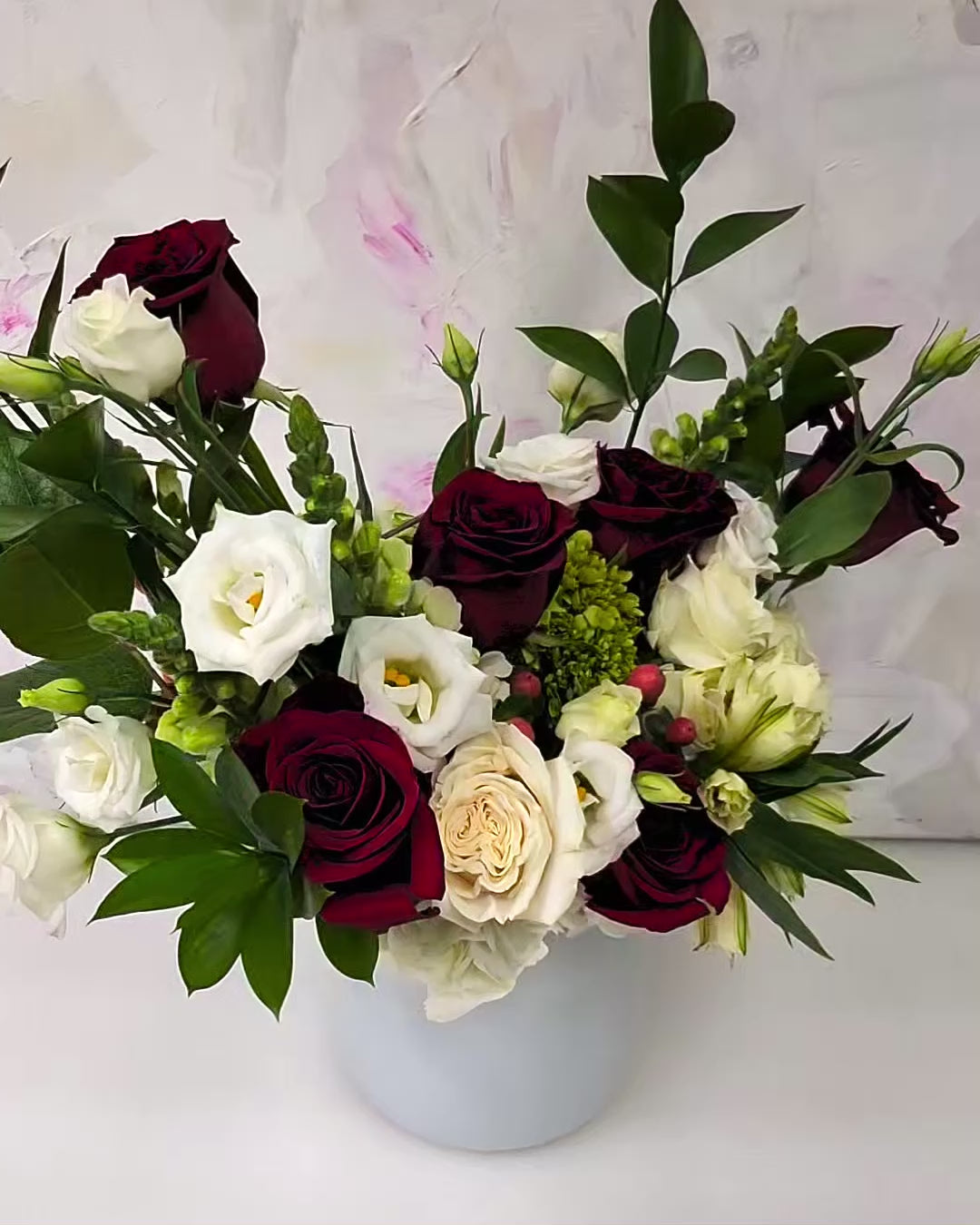 This elegant arrangement features a stunning mix of deep red roses and creamy white blooms.A perfect choice for anniversaries, holidays, or simply expressing sincere gratitude