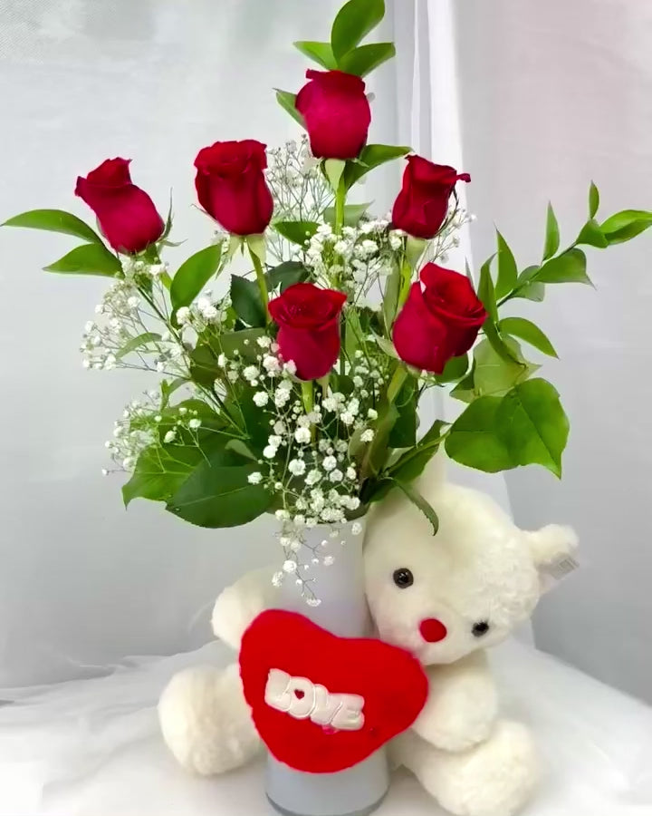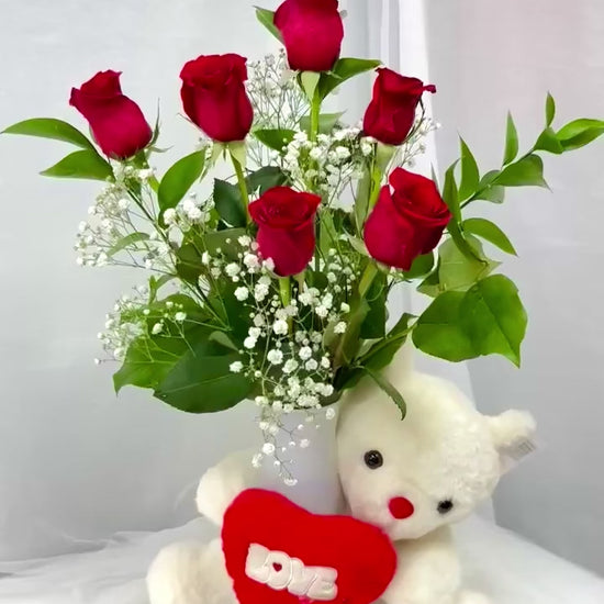 A perfect harmony of passionate red roses and a soft, cuddly teddy bear. Express your love with this timeless gift set.