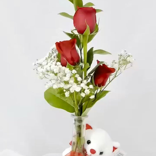 A perfect harmony of passionate red roses and a soft, cuddly teddy bear. Express your love with this timeless gift set.