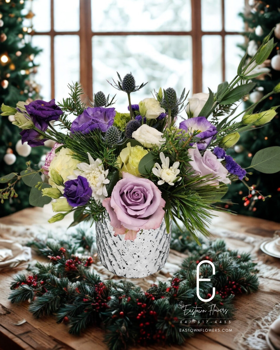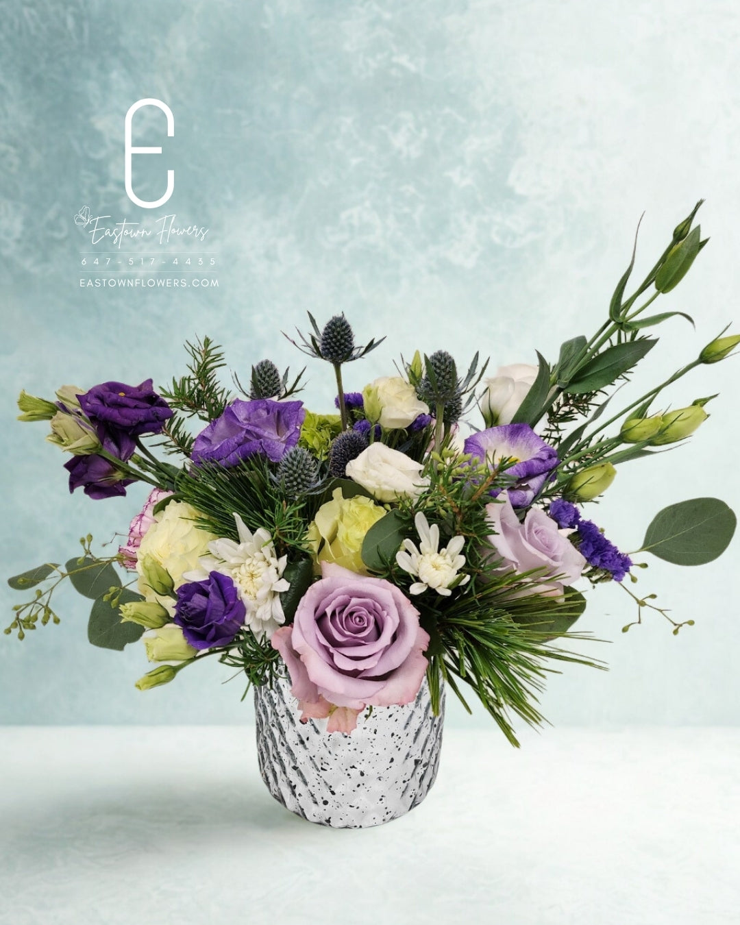 Enjoy a 'Winter In The Heart' with this magical arrangement. The cool tones of lavender roses, deep purple blooms, and frosty blue thistle create a beautiful, dreamy feel, like a winter wonderland.