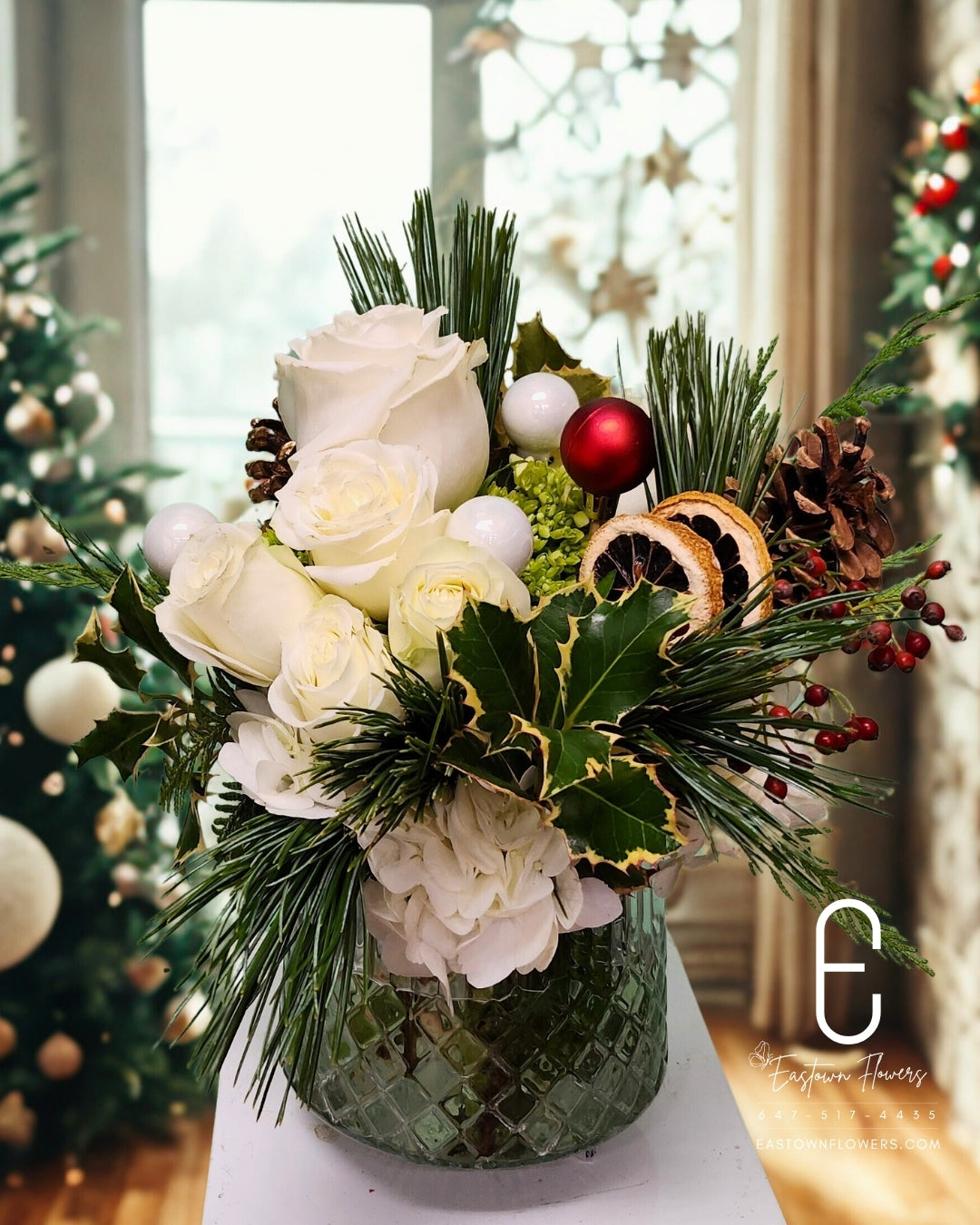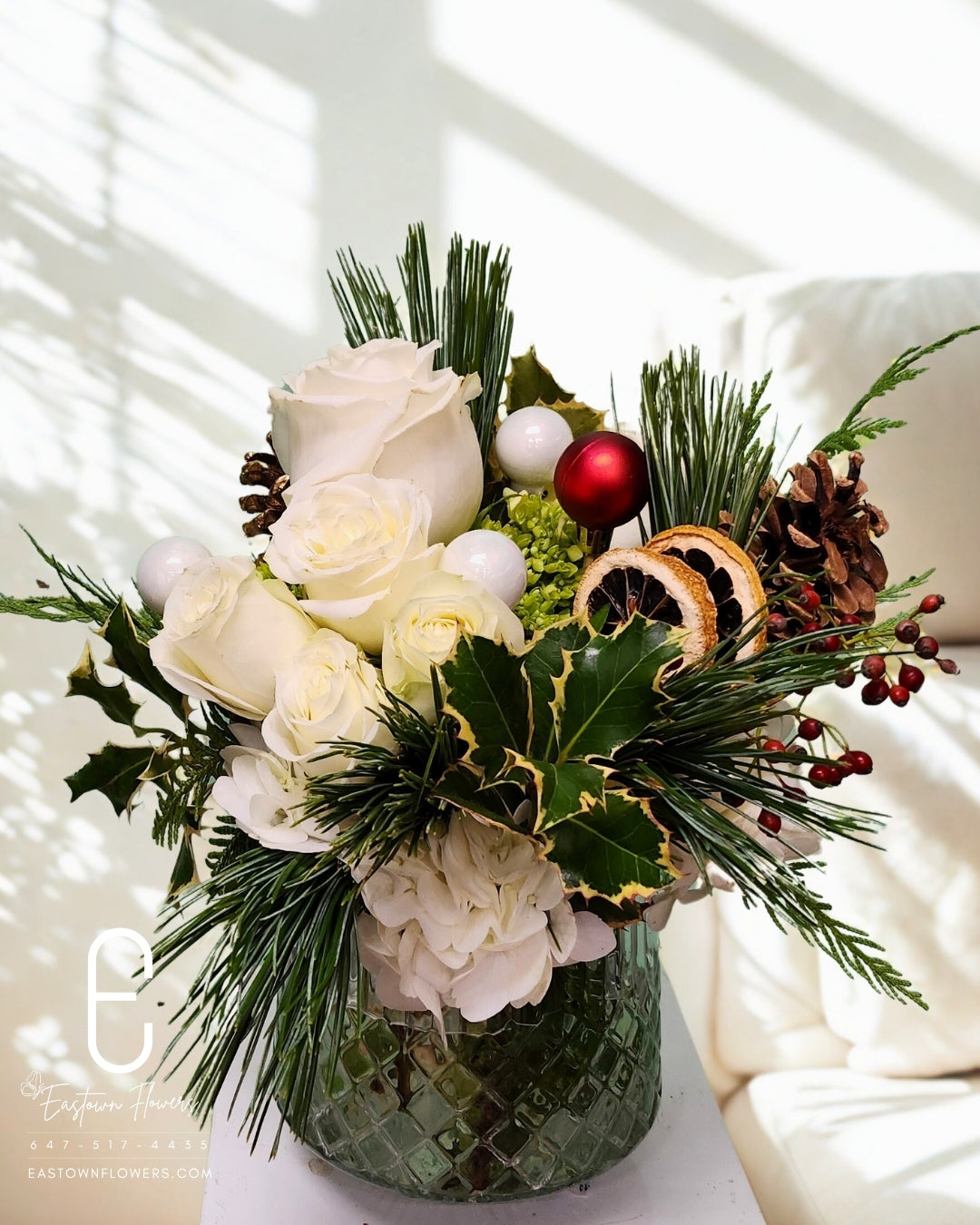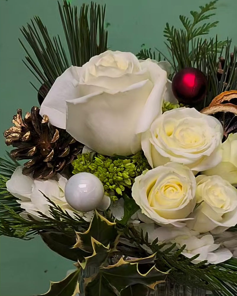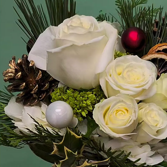 Enjoy a Sweet Christmas with this beautiful arrangement. Fresh roses are in harmony around the points of natural pine cones.
