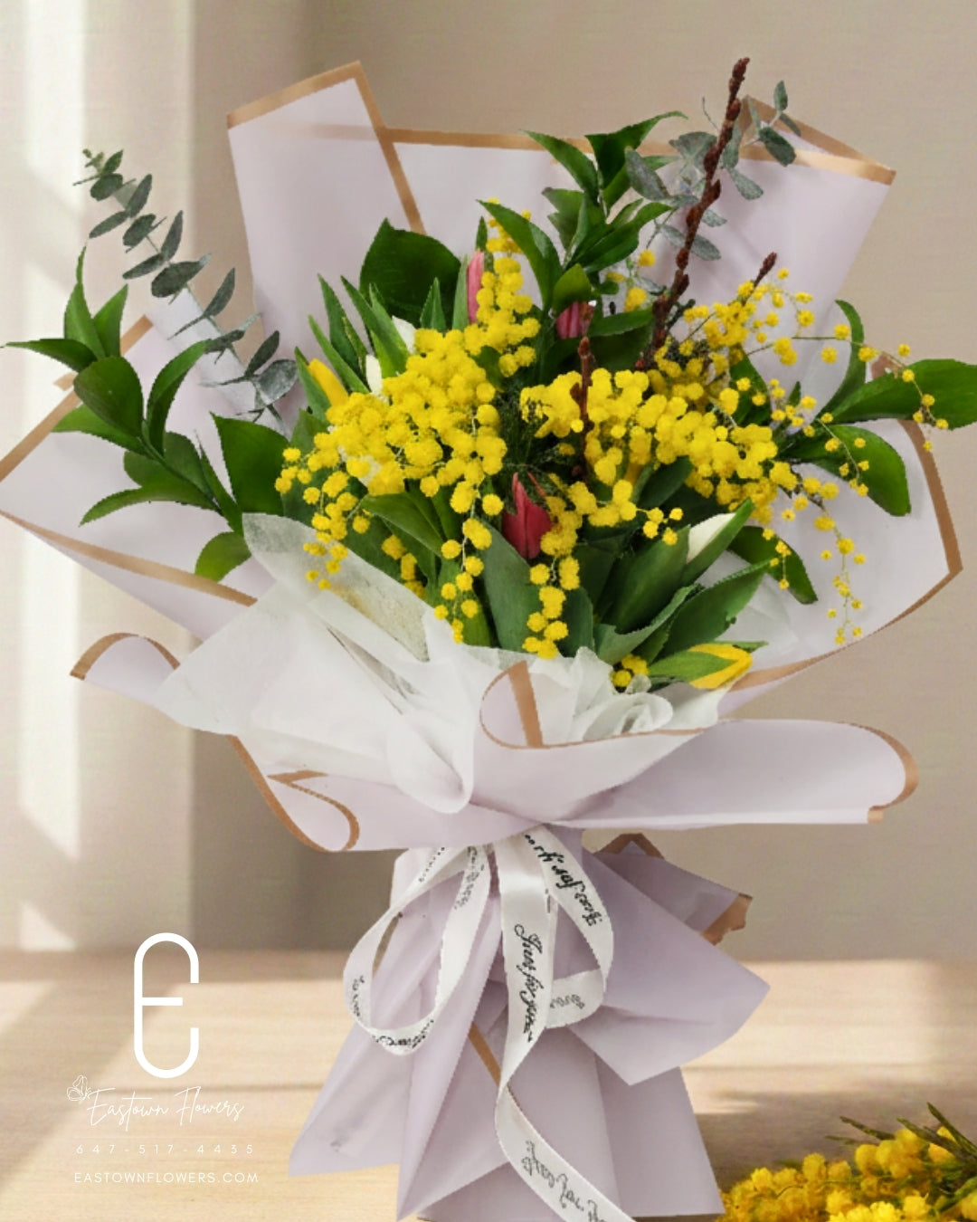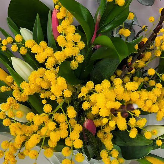 Sophisticated yet natural, this bouquet captures the essence of spring in every petal. Share the gift of elegance and gratitude with our exclusive "Mimosa Tulip Mix" collection.